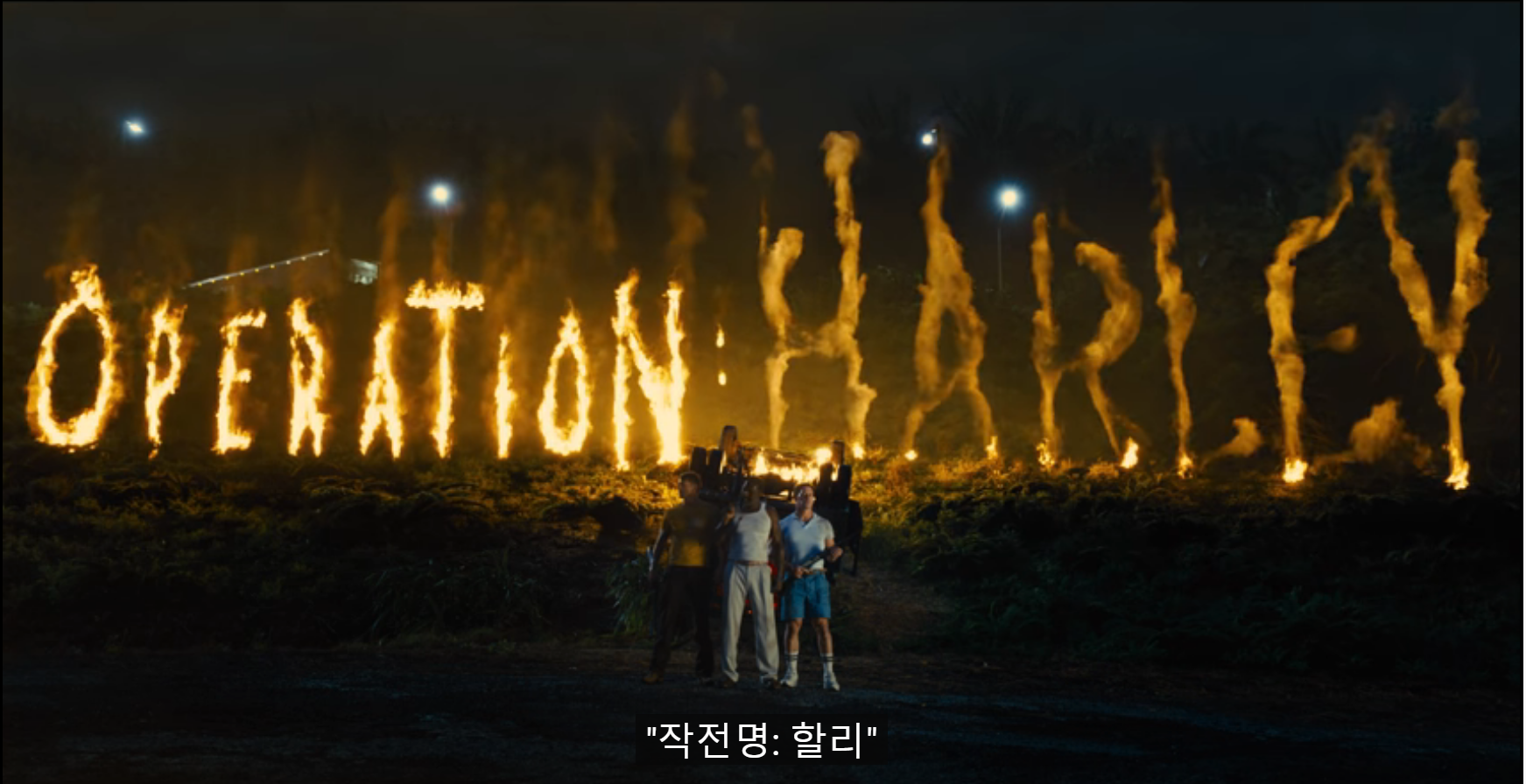 저 위에 자살특공대보고 자살행위야, 그 뒤에 이어지는 그게 우리 일이다의 대사를 돌이켜보자. 이 지점에 도달하기까지 극의 긴장감도, 그 해소도 온전하지 않은 느낌이다. 그런데 저게 웃기겠어? 웃기겠냐구..